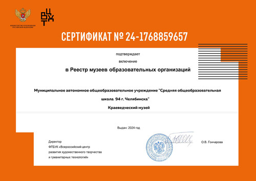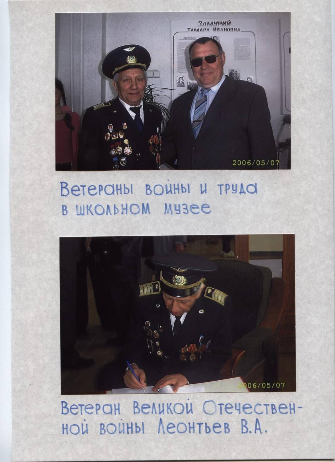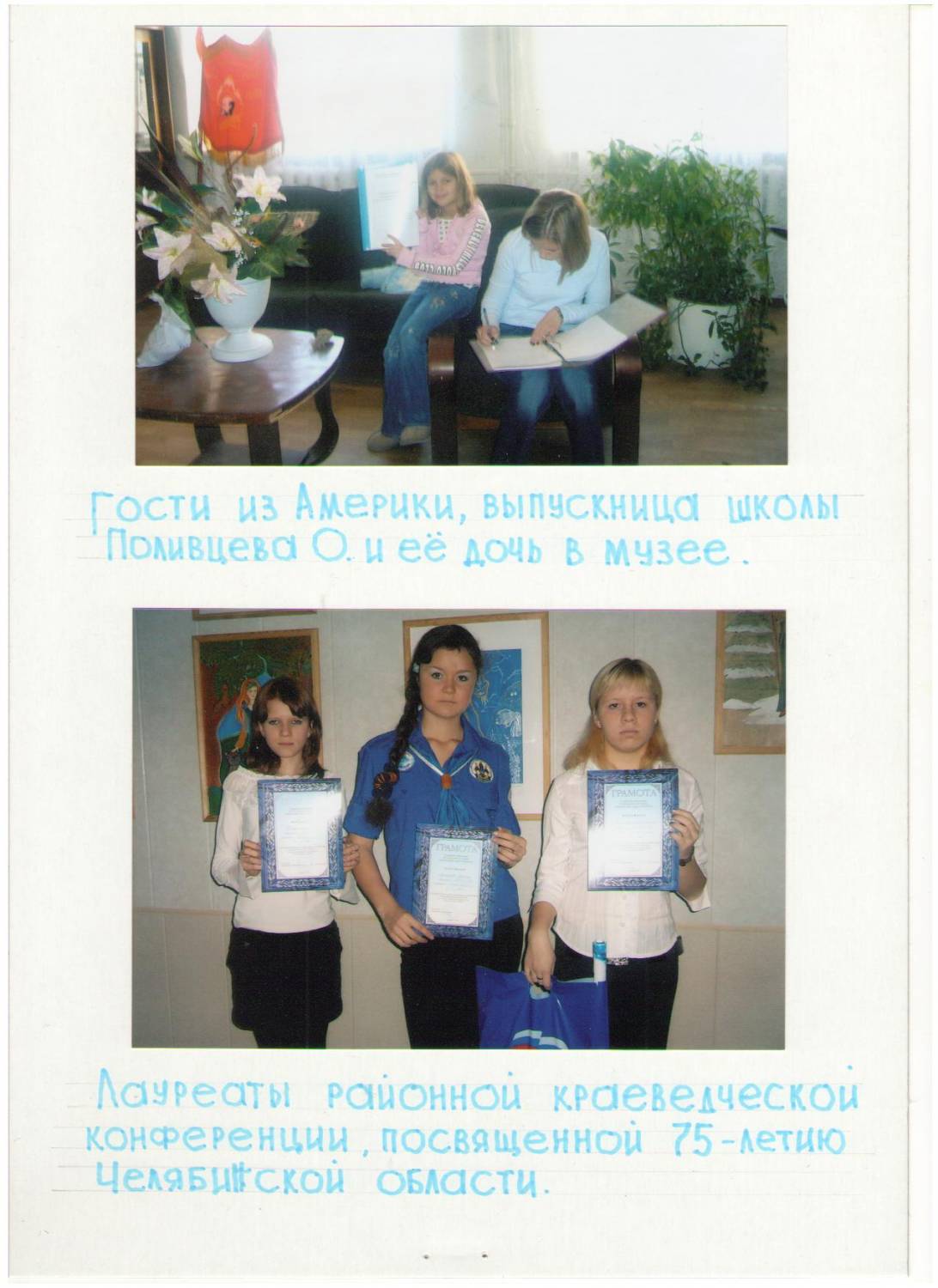 У нас имеется папка «Они работали в нашей школе», в которой хранятся сведения обо всех учителях, длительное время работавших в школе. В этих папках в хронологической последовательности рассортированы фотографии, иллюстрирующие жизнь школы с 1962 года по настоящее время. Здесь помещены материалы рефератов, интервью выпускников нашей школы: «История посёлка Аэропорт», «Интересные люди нашего посёлка»; также альбомы: «Говорят герои победы» (о работниках авиапредприятия участниках Великой Отечественной Войны), «Наш Тимур» (о Тимуре Михайловиче Фрунзе, чьё имя носила пионерская организация нашей школы, в музее также хранится знамя пионерской дружины); «Книга почётных гостей клуба выходного дня», который долгое время работал в школе; книга отзывов для посетителей музея, а также поздравительное письмо главы города Челябинска Вячеслава Михайловича Тарасова к 40-летнему юбилею школы.