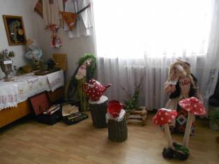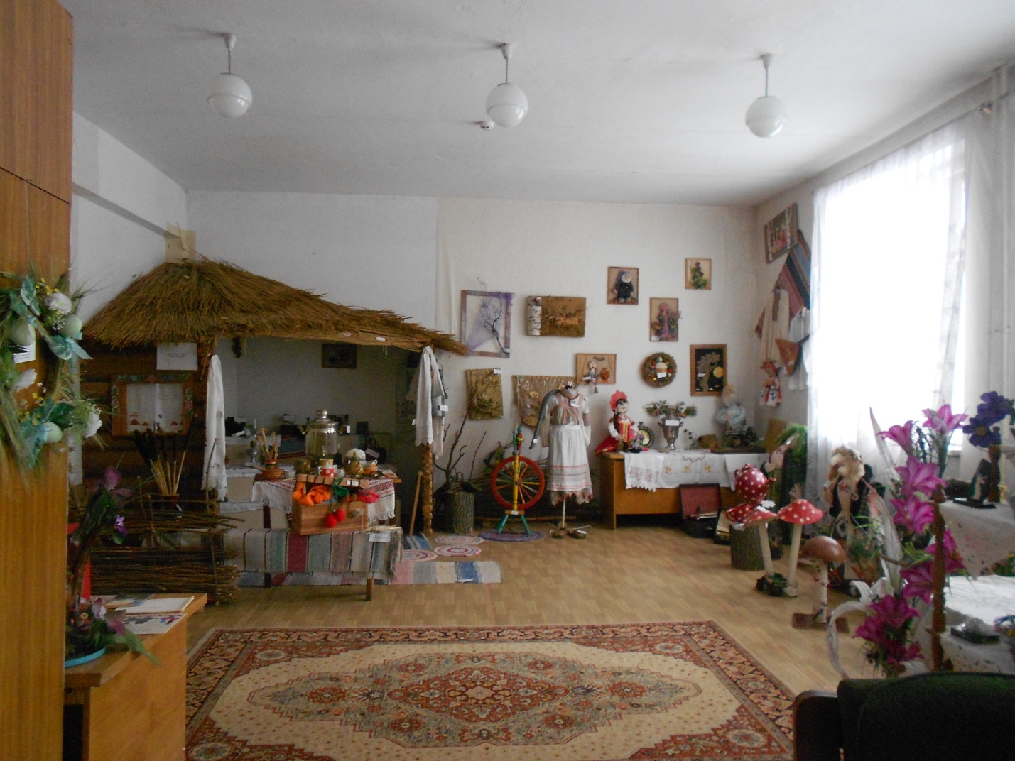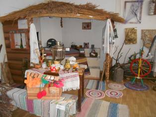 Переходим ко второму разделу нашего музея. Это непосредственно декоративно-прикладное творчество. Центральное место здесь занимает русская изба. Давайте заглянем внутрь избы. Здесь вы увидите предметы русского быта: печка, старинные утюги, яркий красочный сундук, прялка, которой пользовались наши прабабушки, керосиновые лампы, самовар, рукомойник и многое другое, во дворе около избы конское седло, а далее плетень, которым в деревнях ограждали огороды, палисадники.