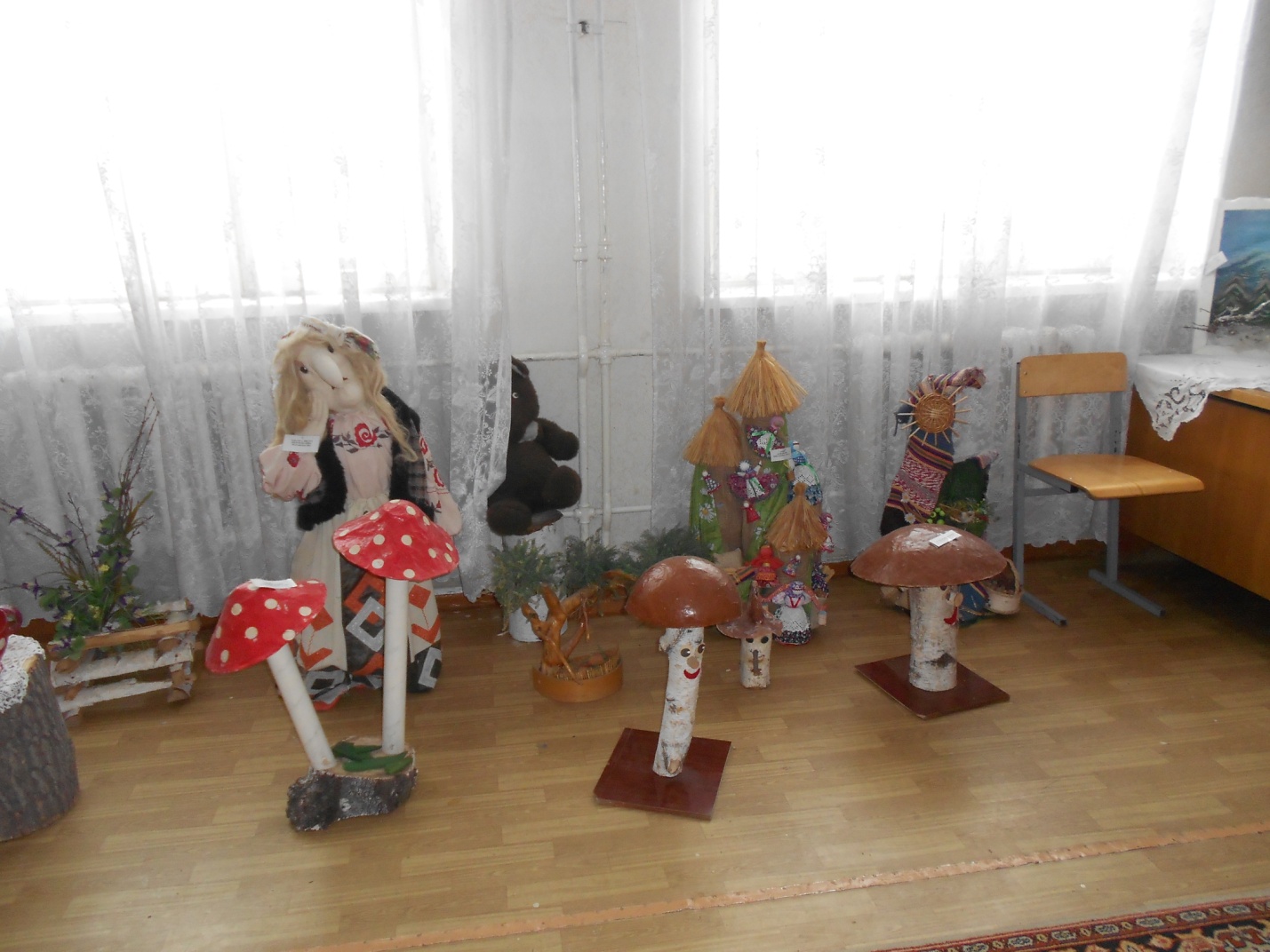 Все остальные работы, представленные в разделе, выполнены руками самих учащихся. Это в основном работы с применением природного материала. (Назвать работы и фамилии изготовителей). Многие из них участвовали в городских и районных выставках и занимали призовые места. Это напольные, настольные, настенные цветочные композиции. А также наши учащиеся занимаются созданием кукол. Вот, например, эта кукла Матрёна подучила на областном смотре в 2003 году звание лауреата первой степени. Выполнила её Часовских Алена, а в 2004 году кукла дед Матвей на городской выставке в музее прикладного искусства Урала заняла первое место. Выполнила эту работу сестра Алёны - Татьяна Часовских.